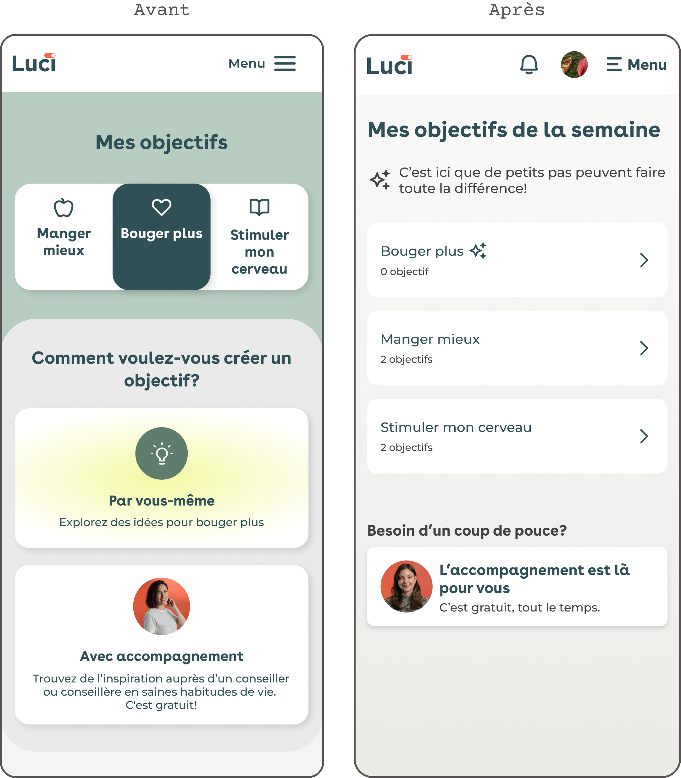 La première étape était de retravailler la page « Mes Objectifs. » Par sa navigation et son manque de guidance, elle n’était pas un bon point de départ pour l’expérience.